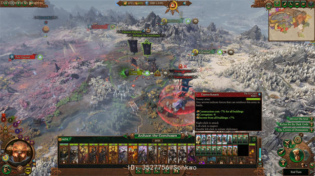 这次的《混沌冠军勇士》DLC 可谓是诚意满满:不仅带来了四个风格各异、机制不同的全新派系,还全面重做了初代的三位混沌传奇领主,甚至连着全体混沌势力的玩法一起改了,接下来我们一个个说。 首先,混沌勇士派系现在拥有了新机制【混沌赠礼】。玩家可以在战斗中收集灵魂,并用骷髅头解锁不同的 BUFF 或混沌恶魔单位,赠礼的选择会直接影响到一整局的发展规划。 其次,混沌勇士现在能够占领城市,而且能在混沌荒原和诺斯卡地区的行省首府建立黑暗要塞,直接奴役该行省中的诺斯卡派系。玩家击败诺斯卡、混沌恶魔、混沌勇士和鼠人派系时,也可以选择成为它们的宗主国。